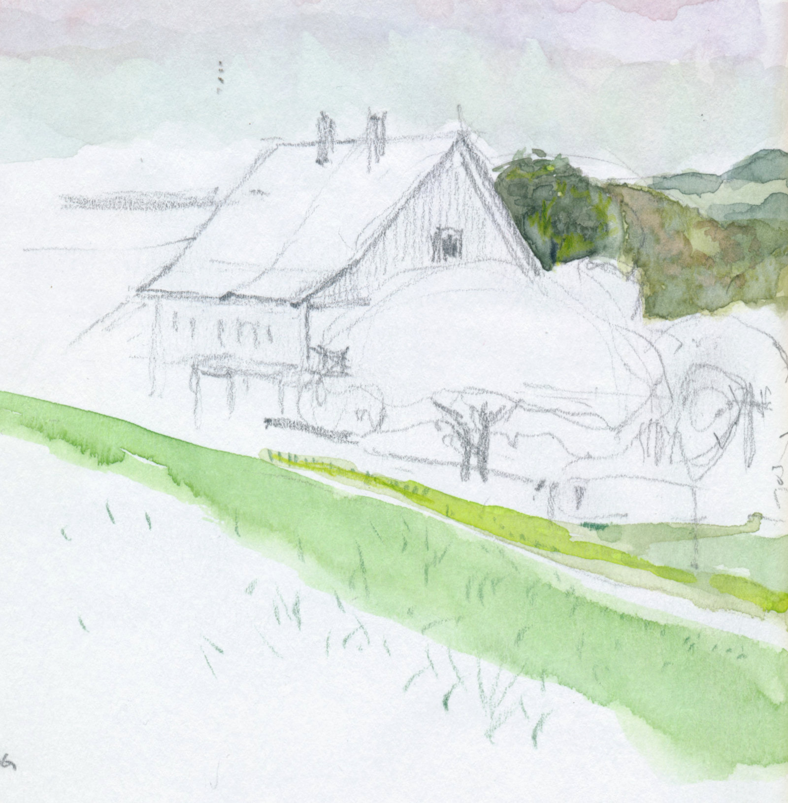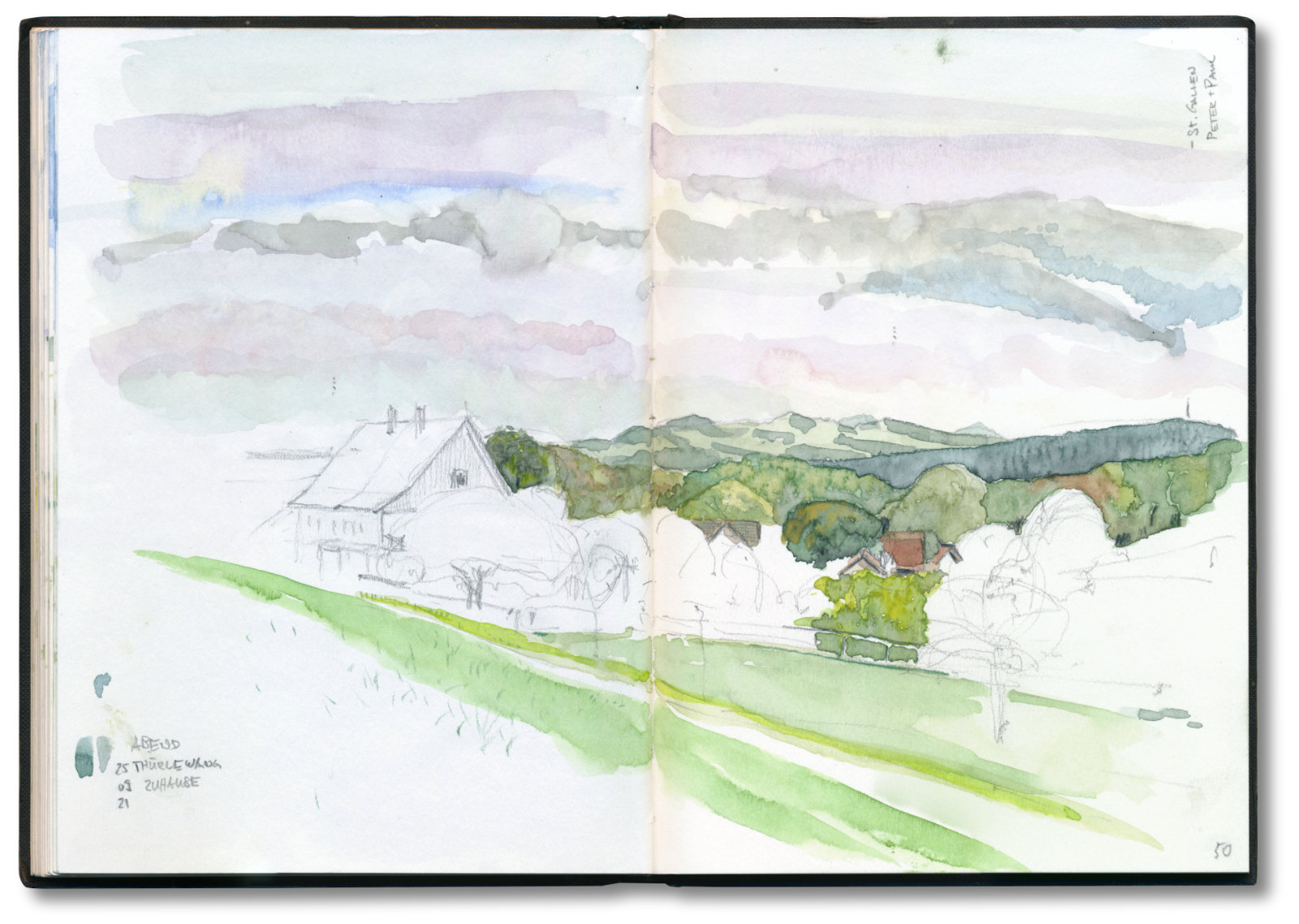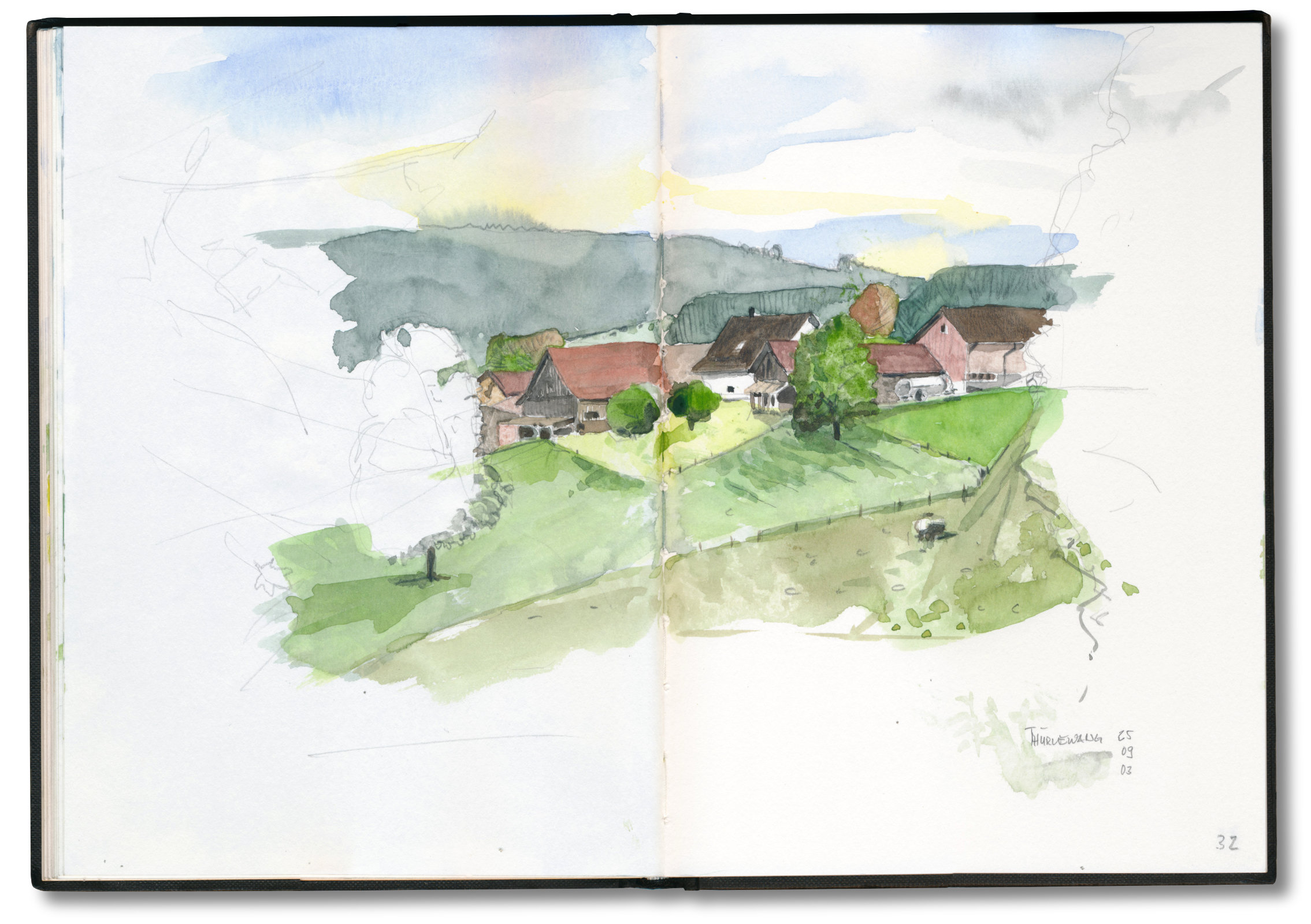 Das Gefühl der Geborgenheit, die vertraue Umgebung, sowie die nächsten Menschen machen aus einem Ort ein Zuhause. Wenn ich von einer kleineren oder grösseren Wanderung zurückkomme, sind es emotionale Momente, die ich nicht in Werte fassen kann. Diese kleinen Runden sind Peaks in meinem Alltag. Alltägliches intensiv erleben. Zwischen drin ist auch mal das Skizzenbuch dabei und die Runden dauern mit Pause ein wenig länger. Tausendmal habe ich die Landschaft mit den kleinen Weilern schon gesehen. Zu Hunderten habe ich sie schon gezeichnet. Langweilig wird es nie, meine Sinne sind offen und mein Blick ändert sich immer wieder auf ein Neues.