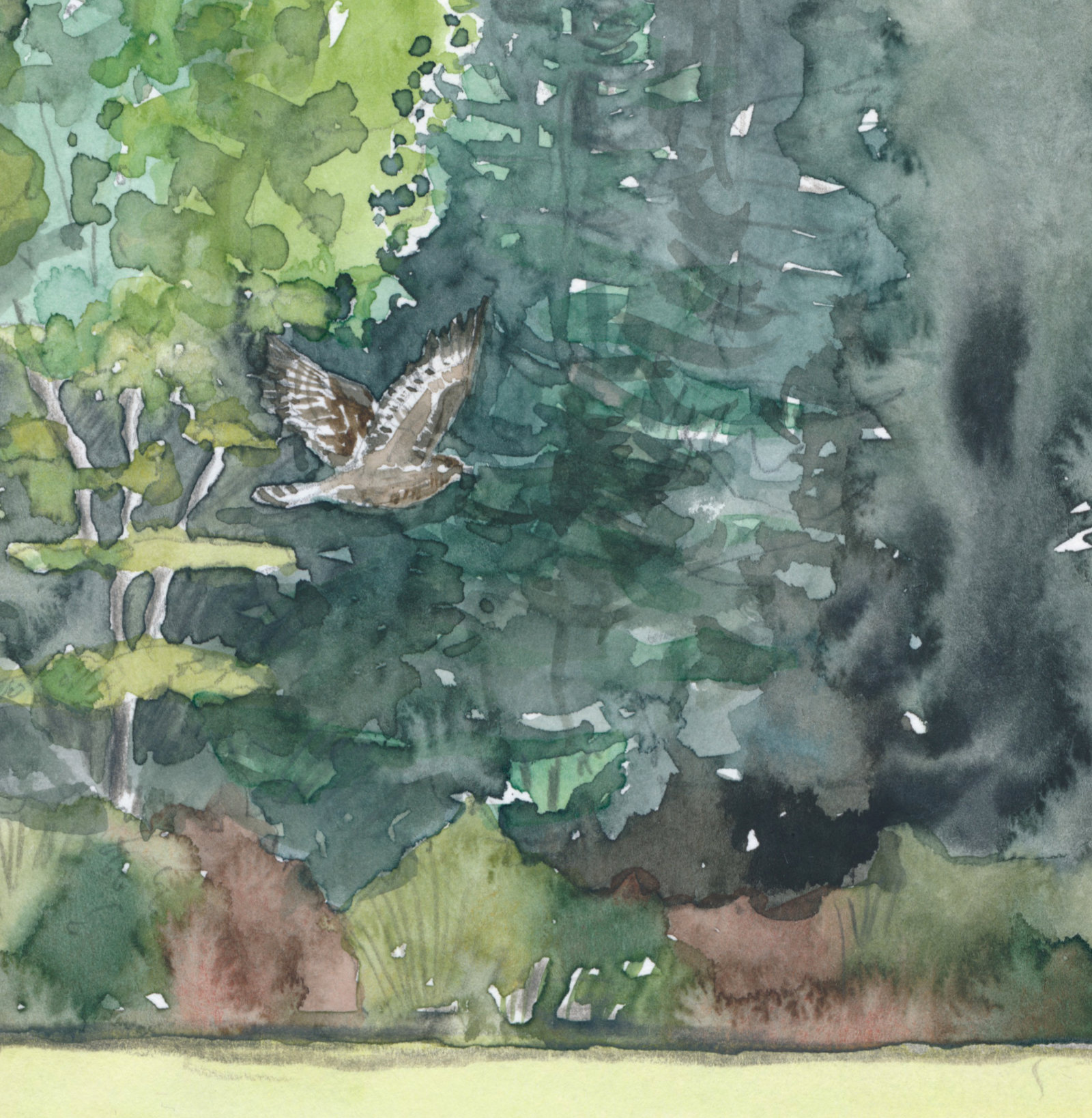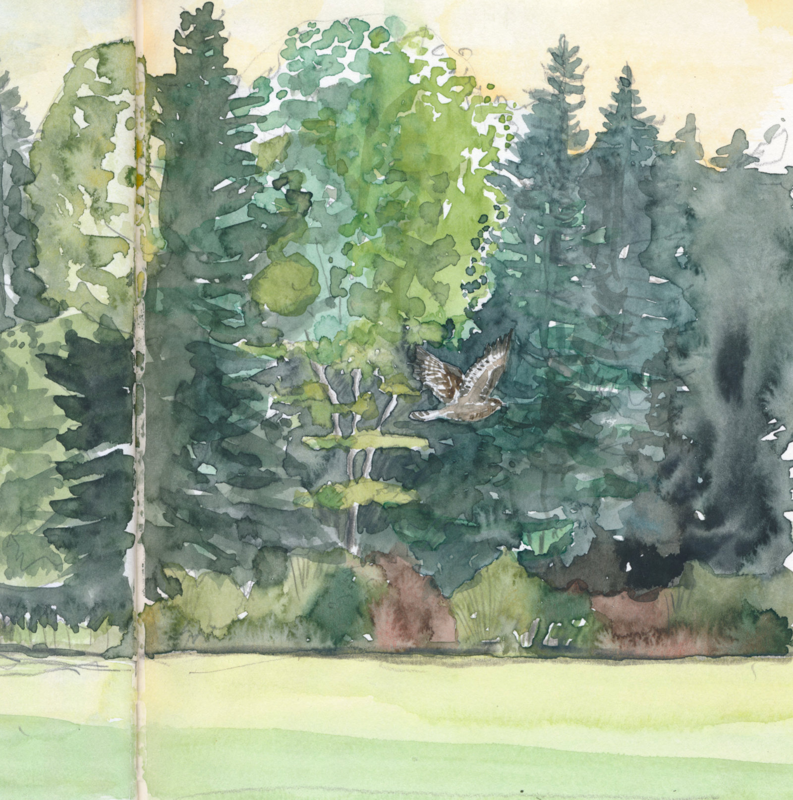 Am Abend liegt die Wiese im warmen Grün vor mir und ein paar Stunden später glitzert der Morgentau im Licht der aufgehenden Sonne. Dunkel stehen die Tannen im Gegenlicht. Und wieder kehrt abends Ruhe ein. Der Mäusebussard fliegt leise zur nächsten Warte.